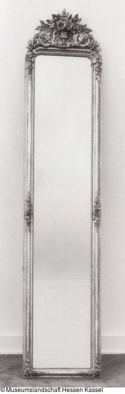 Während die Rocaillemotive dem 18. Jahrhundert entlehnt sind, verweisen die naturalistisch gestalteten Blüten der Bekrönung auf den Geschmack der Mitte des 19. Jahrhunderts. Hohe schmale Wandspiegel waren zunächst im 18. Jahrhundert sehr beliebt, wurden aber im Zweiten Rokoko wieder aufgegriffen. Sie konnten an Wandpfeilern, zum Beispiel zwischen den Fenstern, zur optischen Gliederung eines Raumes dienen.