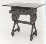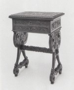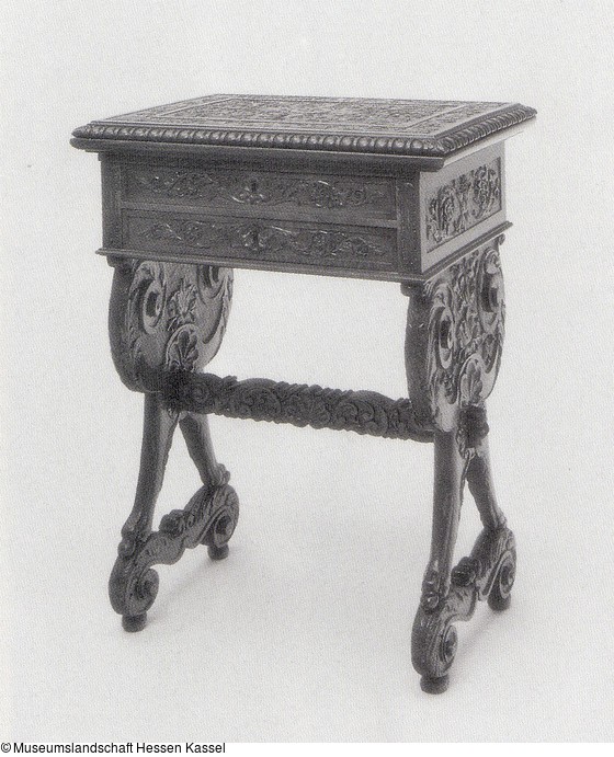 Nach Auskunft der Tochter Lieselotte, aus deren Besitz der Nähtisch stammt, fertigte ihr Vater Oberst a. D. Georg Holtz (1866-1932) den Tisch selbst. Als Entwerfer und Möbelschreiner war er Autodidakt. Unter der dreh- und aufklappbaren Tischplatte finden sich Fächer für Nähutensilien.