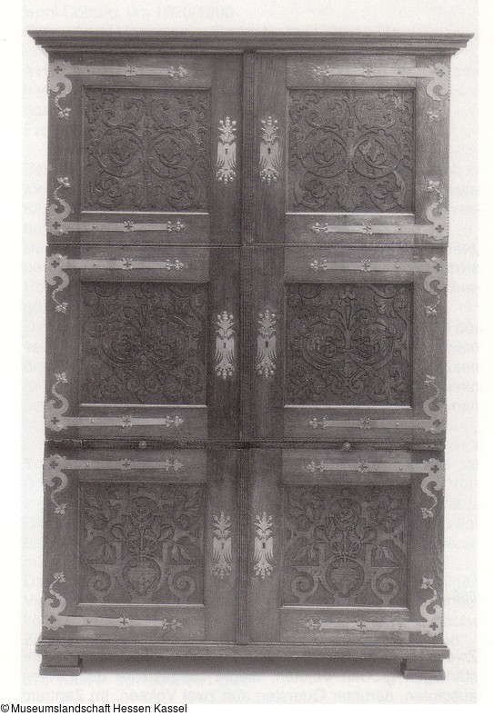 Nach Auskunft der Tochter Lieselotte, aus deren Besitz der Schrank stammt, fertigte ihr Vater Oberst a. D. Georg Holtz (1866-1932) den Schrank selbst an. Als Entwerfer und Möbelschreiner war er Autodidakt. Vgl. KP 1982/41-45.