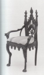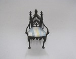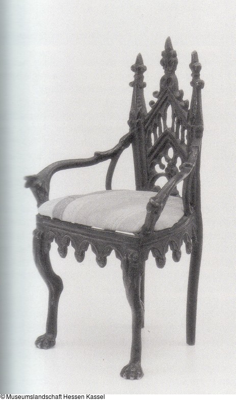Bronzeguß, dunkelbraun eingefärbt, aus mehreren Teilen zusammengefügt. Kissen mit gestreifter Biedermeier-Seide überzogen. |
