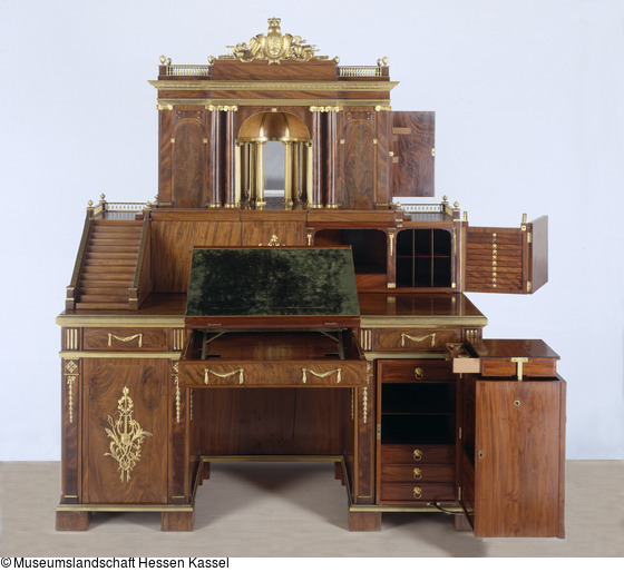 Vor allem die raffinierten Inneneinbauten kommen den Prachtmöbeln David Roentgens (1743-1807) aus der Zeit um 1780/90 für den russischen Zarenhof sehr nahe.