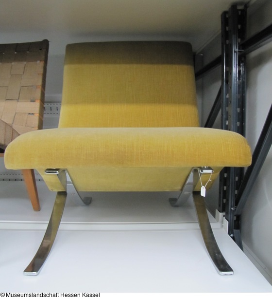 Verchromte Stahlbänder, Polster mit senfgelbem Cordsamtbezug