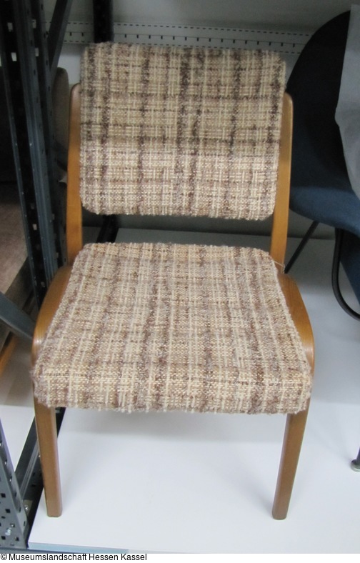 Federholzstuhl, h-förmige Seitenteile, Sitz- und Rückenteile gepolstert und braunkariert bezogen